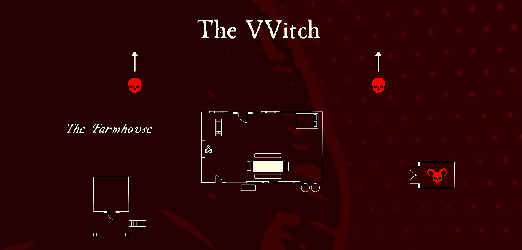 At a glance, the bleak simplicity of the floor plan itself suggests something about the oppressiveness of the space the family lived in, and doesn’t need any tokens or text added by me to show this. It is a suffocating environment of whispers and paranoias of privacy: the entire farm site could have been showered in skull markers to indicate the menace. In creating this floor plan, I came to take that as Eggers’ point here: whatever ramparts we construct against the outside world, we cannot escape ourselves. The farmstead and the woods, to me, represent a psychological brink in which we encounter a more chasmic version of us, and the VVitch is as much about confronting our internal demons as it is about satanism and witchcraft.
