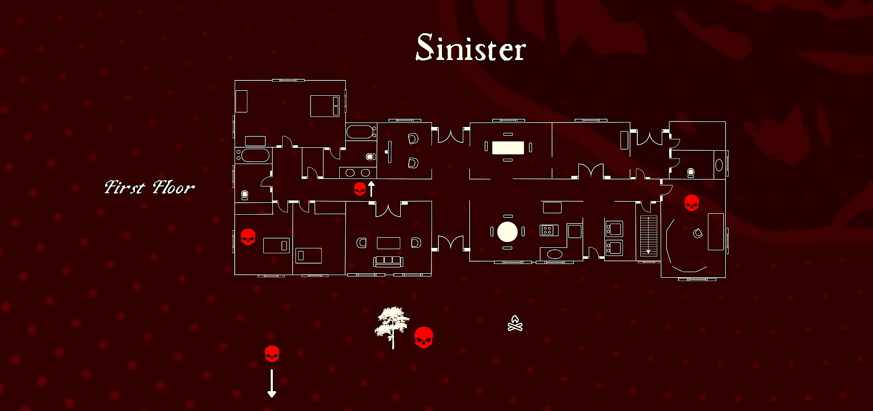 The red skulls in this floor plan run along the hallway like the spooky spinal cord of an even spookier nervous system. You would think a straight hallway wouldn’t be confusing, but Derrickson even manages to play around with this space, too. The attic, where major plot moments occur throughout the story would logically have to be placed closer to Ellison’s office than the bedroom wing, for all the activity that goes on there. Yet in the scenes where the attic ladder is pulled down, it appears to be near the end of the hallway where the bedrooms are; even in this choice, I am not sure that I have situated it correctly. The skull icon in the main hallway points up to indicate where I decided the hatch to the attic must be located.